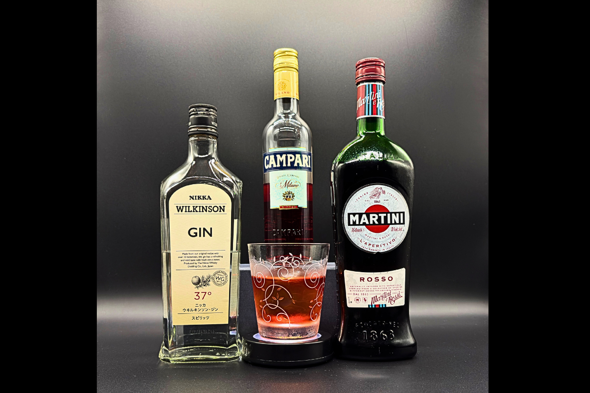 ジン、カンパリ、スイートベルモットで作れるショットバーでは定番のカクテルの一つ。